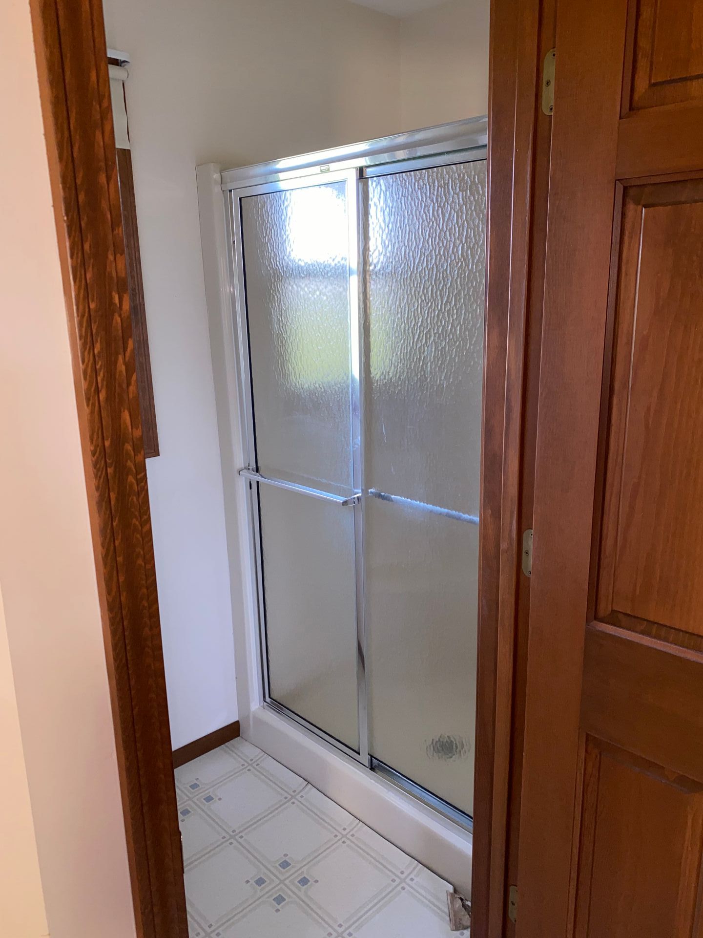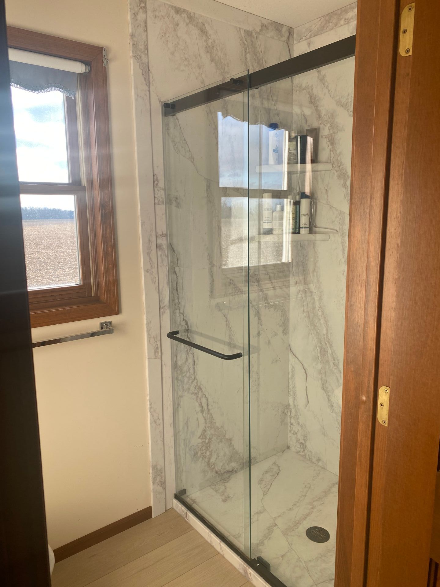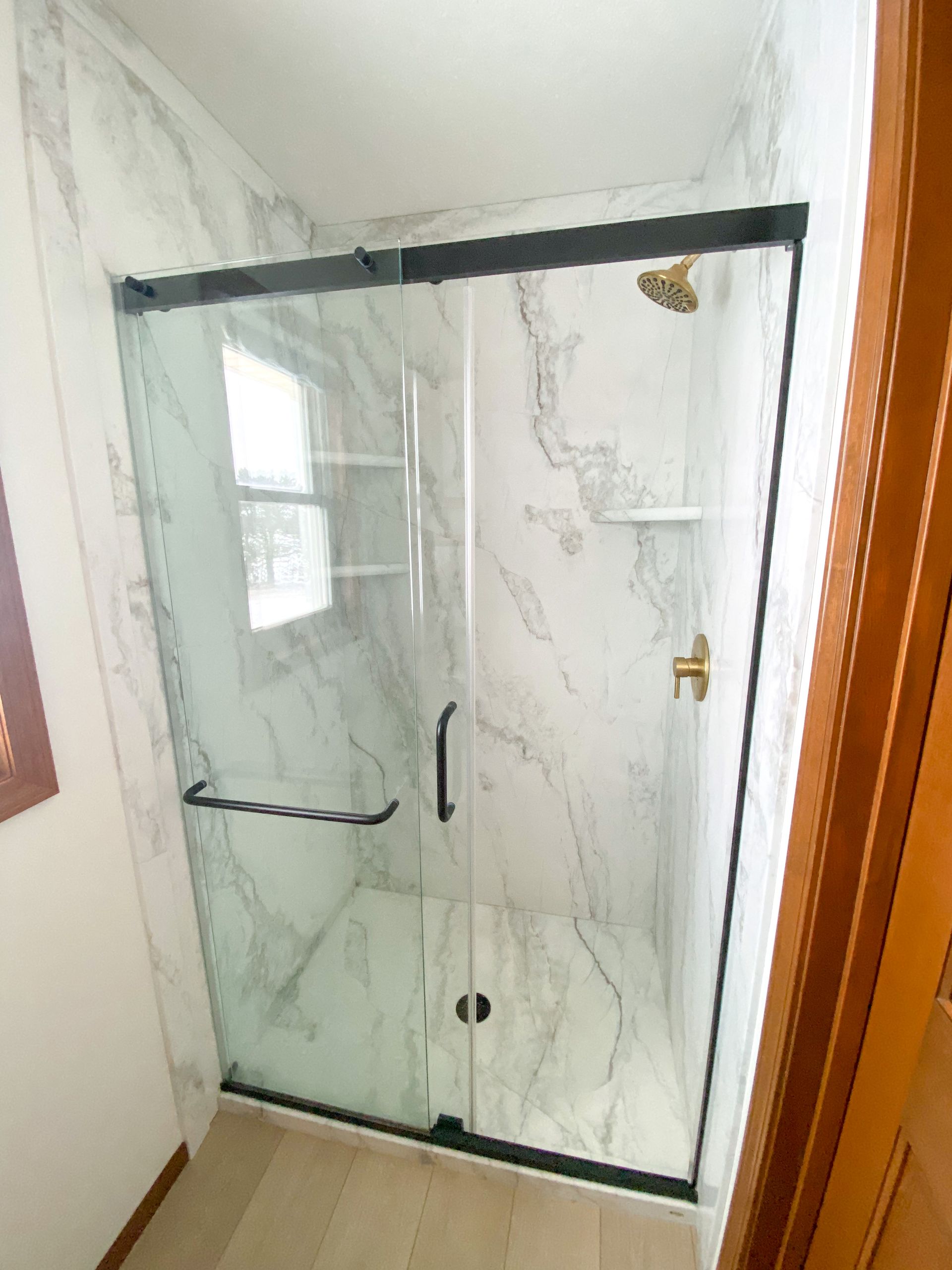 The leak left us with a new spacious shower, sliding glass door, updated fixtures, and flooring.